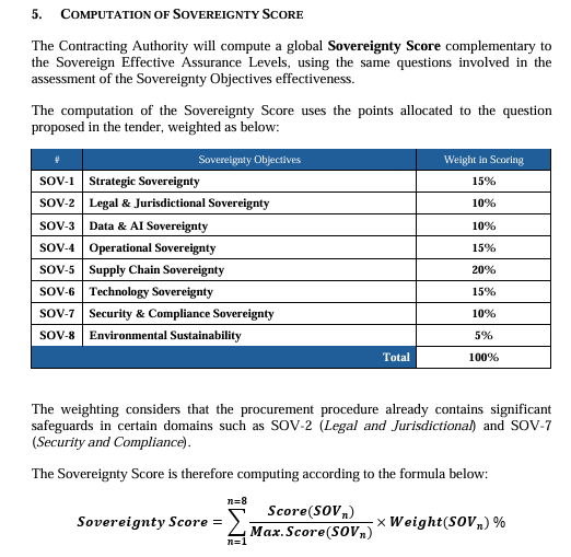 La commission européenne créé le score de souveraineté. Elle introduit un cadre pour un cloud de confiance qui inclut un système de score de souveraineté destiné principalement aux marchés publics.
